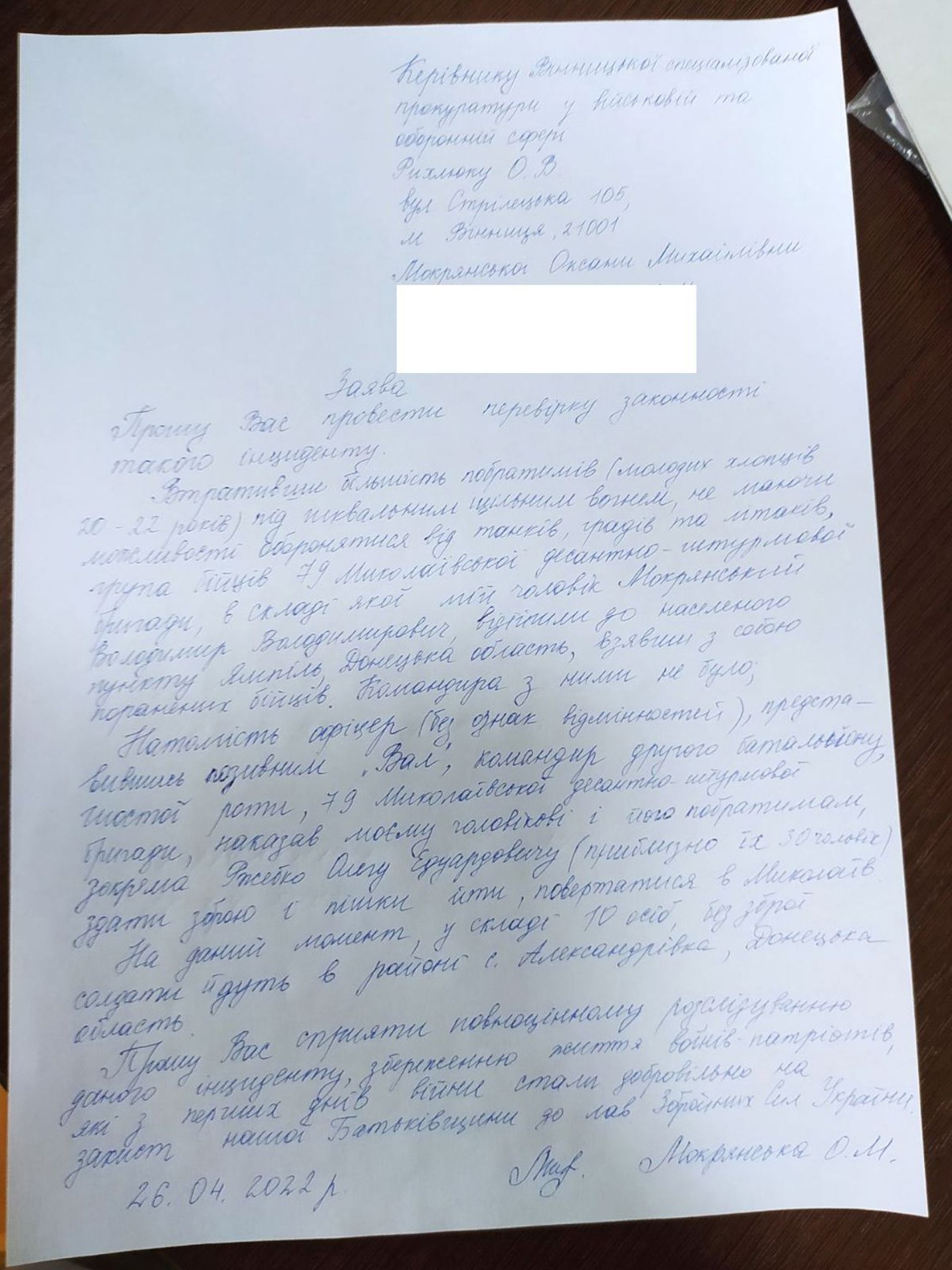 — Также я уже была в военной прокуратуре Винницкой области, написала заявление о преступлении и у меня его приняли. Военный прокурор начинает работать. Я ему передала видео, которое записали наши мужчины, прокурор сказал, что понял, – говорит Оксана Мокранская. — Мой муж и другие военные, которым удалось выйти из окружения, категорически отказываются возвращаться в 79-ю бригаду, ведь считают, что в руководстве, наверное, есть какой-то командир, предающий Украину. Не дав никакого подкрепления ни артиллерии, ни техники, их просто бросили почти безоружных на этот отрезок фронта, чтобы россияне его легко прорвали и заодно — убили патриотов-добровольцев. Все, как хочет российская пропаганда: чтобы были уничтожены патриоты и остались только те, кто будут лояльны… Контрактники на данное задание отказались уходить, а добровольцы, которые по своей воле мобилизованы с первых дней войны, ушли. В результате из ста человек выйти удалось только 30, остальные 70 погибли… Под шквальным огнем тяжелой и реактивной артиллерии и авиации наши мужчины держались пять дней. Утратили большинство собратьев и, не имея средств и возможности вести оборону дальше, вышли из поля боя с личным оружием. Всю ночь они пешком шли через лес, унося раненого побратима-винничанина Петра Короля, на глазах которого от пули погиб еще один винничанин Сергей Романов. По дороге к позициям ВСУ наши бойцы встретили командира, который, выйдя из машины, им сказал возвращаться обратно на позиции, а по просьбе хотя бы забрать раненого — отказался и уехал. Часть вернувшихся ребят уже на следующий день попала в плен, что свидетельствует об одном — эти позиции уже были сданы! Что касается группы, где был мой муж, дальше по дороге они встретили офицера, без признаков отличий, который представился командиром шестой роты второго батальона 79-й Николаевской отдельной десантно-штурмовой бригады с позывным «ВАЛ» и под дулами автоматов заставил сдать личное оружие, приказав идти пешком в Николаев. дезертирство. В конце концов, мой муж с товарищами поймали «попутку», доехали в Краматорск и сразу обратились в Военную службу правопорядка. А еще одна часть отступивших к другой стороне ребят сейчас в Славянске. Им больше повезло в том плане, что не встретили такого командира, как этот «ВАЛ», просто оставивший наших без оружия и начавший обвинять в дезертирстве. представившийся командиром шестой роты второго батальона 79-й Николаевской отдельной десантно-штурмовой бригады с позывным «ВАЛ» и под дулами автоматов заставил сдать личное оружие, приказав идти пешком в Николаев и угрожая статьей за дезертирство. В конце концов, мой муж с товарищами поймали «попутку», доехали в Краматорск и сразу обратились в Военную службу правопорядка. А еще одна часть отступивших к другой стороне ребят сейчас в Славянске. Им больше повезло в том плане, что не встретили такого командира, как этот «ВАЛ», просто оставивший наших без оружия и начавший обвинять в дезертирстве. представившийся командиром шестой роты второго батальона 79-й Николаевской отдельной десантно-штурмовой бригады с позывным «ВАЛ» и под дулами автоматов заставил сдать личное оружие, приказав идти пешком в Николаев и угрожая статьей за дезертирство. В конце концов, мой муж с товарищами поймали «попутку», доехали в Краматорск и сразу обратились 